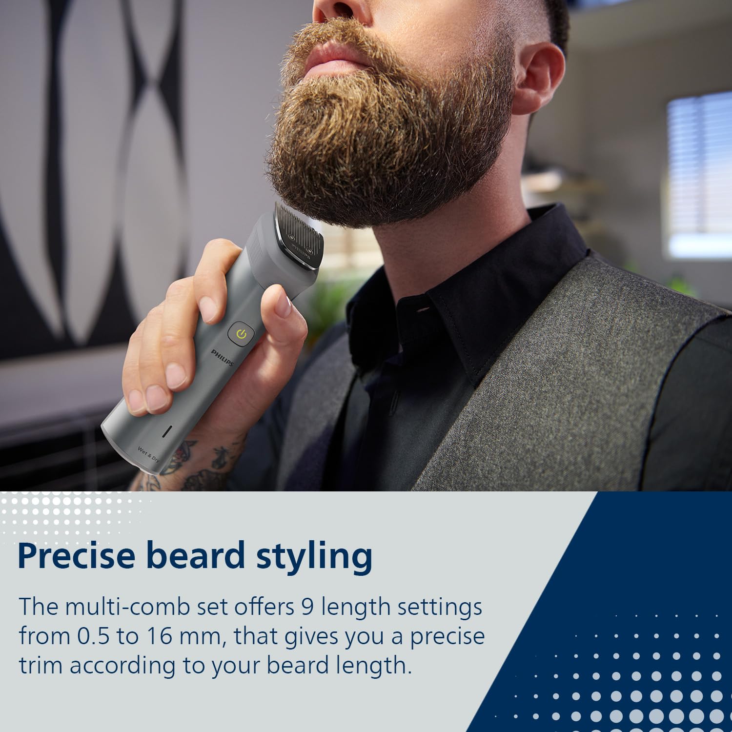 BeardSense Technology : The trimmer scans the beard density 125x per second and boosts power exactly when you need it to tackle also dense, bushy or longer beards.